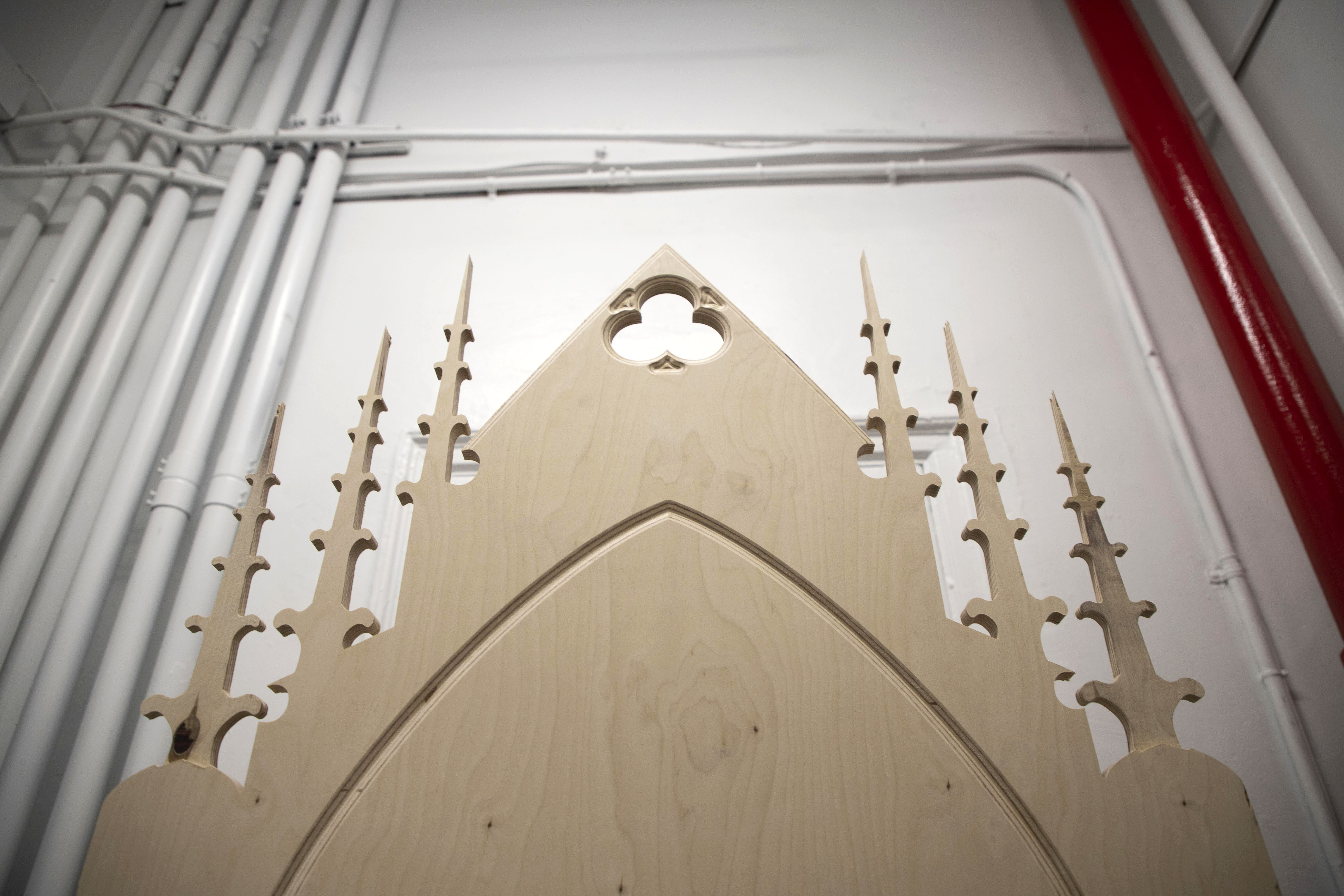 Exploring the similarities between religion and mass production. Gothic tradition meets 21st century machinery—think gothic revival-revival. It’s towering height mimics the awe-inspiring European cathedrals intended to strike fear into the hearts of any passersby. Other architectural elements include gingerbread trim, pointed arches, and—the piece de resistance— a rose window.